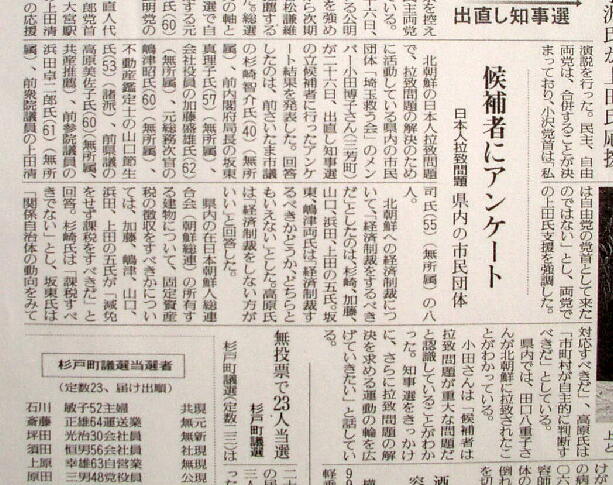 2003年、拉致被害者に対して何かするべきではないかと思い、埼玉県知事選挙全候補者に対して「拉致問題に関して北朝鮮に経済制裁を行うべきかどうか」などについてアンケートを実施しました。その結果を各新聞社に送って読売新聞に掲載されました。