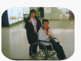 介護をしてくれるヘルパーさんと一緒に、車椅子で福岡に帰るところ。